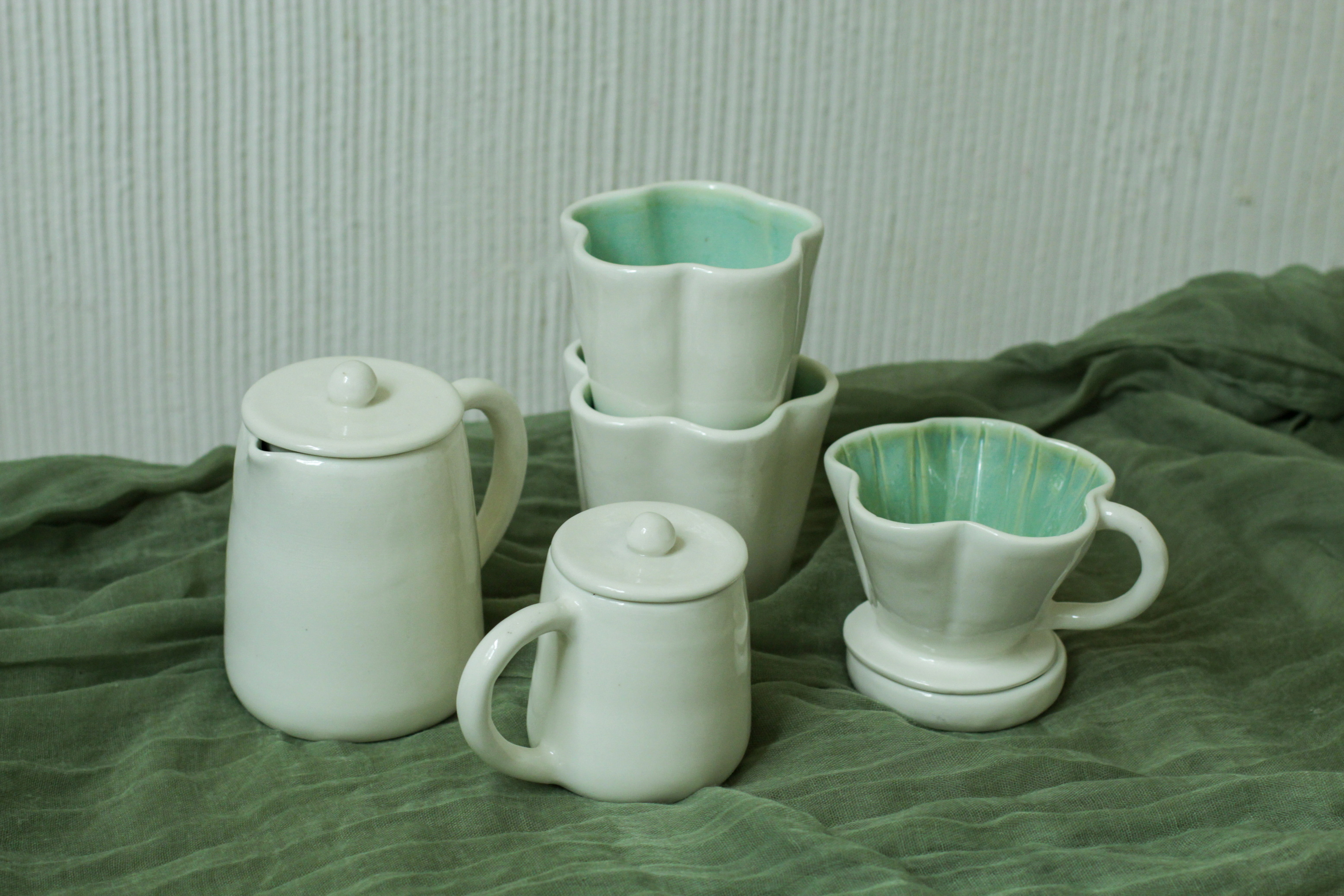 - Элегантный белый набор для фильтр-кофе (из белой полуфарфоровой массы): кофейник с крышкой, воронка, подставка, два стакана и молочник.