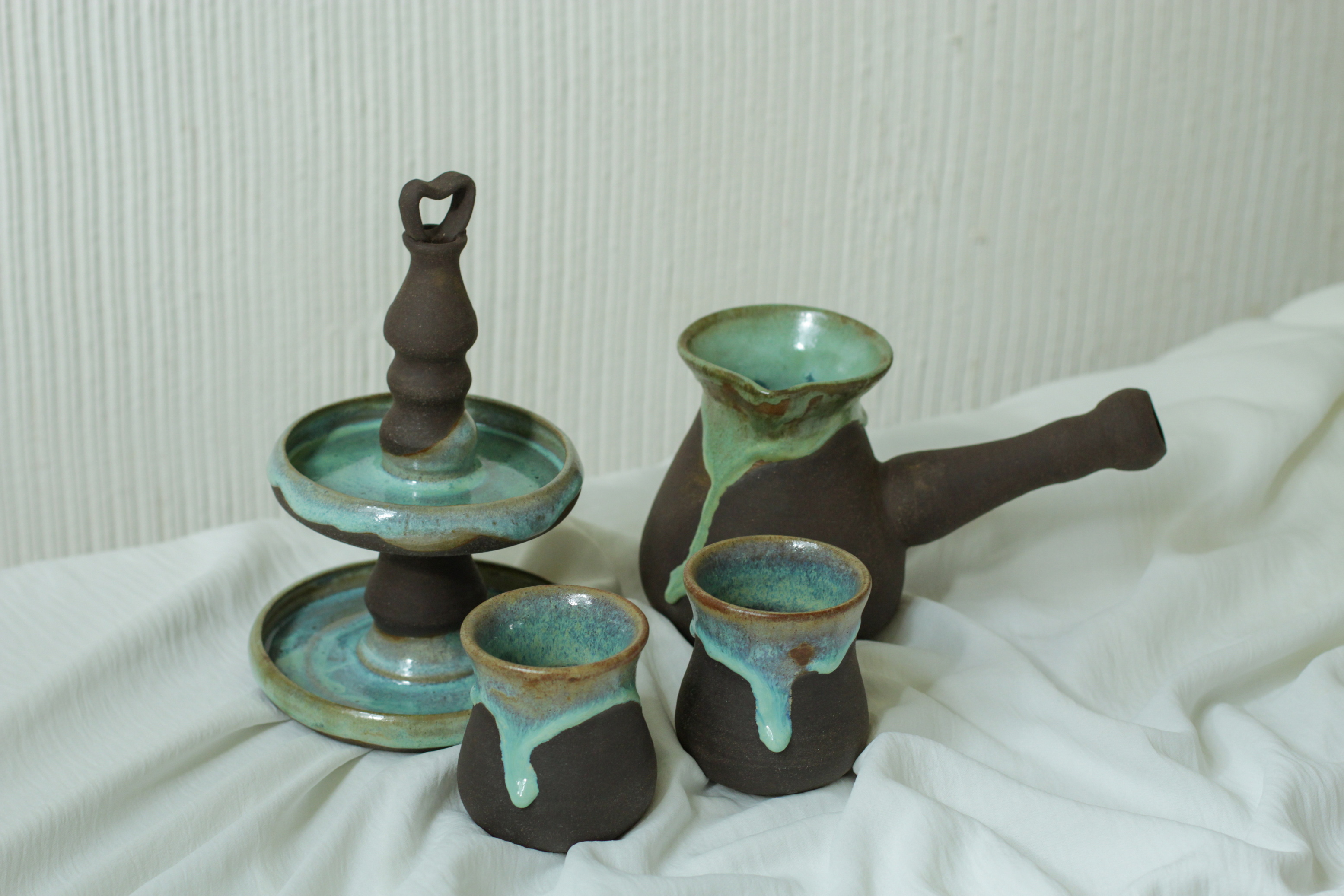 - Брутальный черный набор для кофе по-турецки (из черной шамотированной глины): турку, две кружки и стильную этажерку для сладостей.