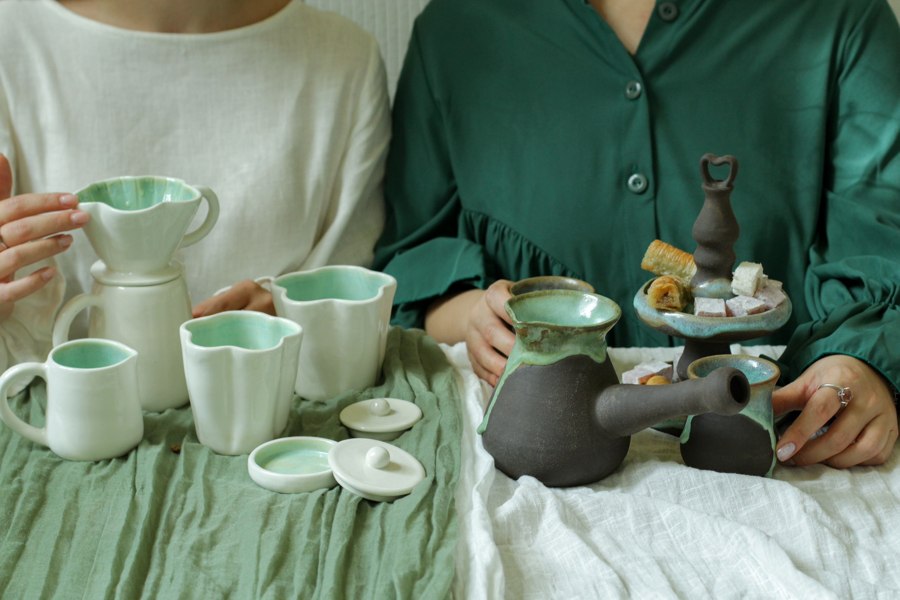 Вы не просто сделаете посуду, а продумаете единую концепцию для каждого комплекта: уникальную форму ручек, повторяющиеся детали, фактуру или цвет глазури внутри изделий, который вы выберете сами.