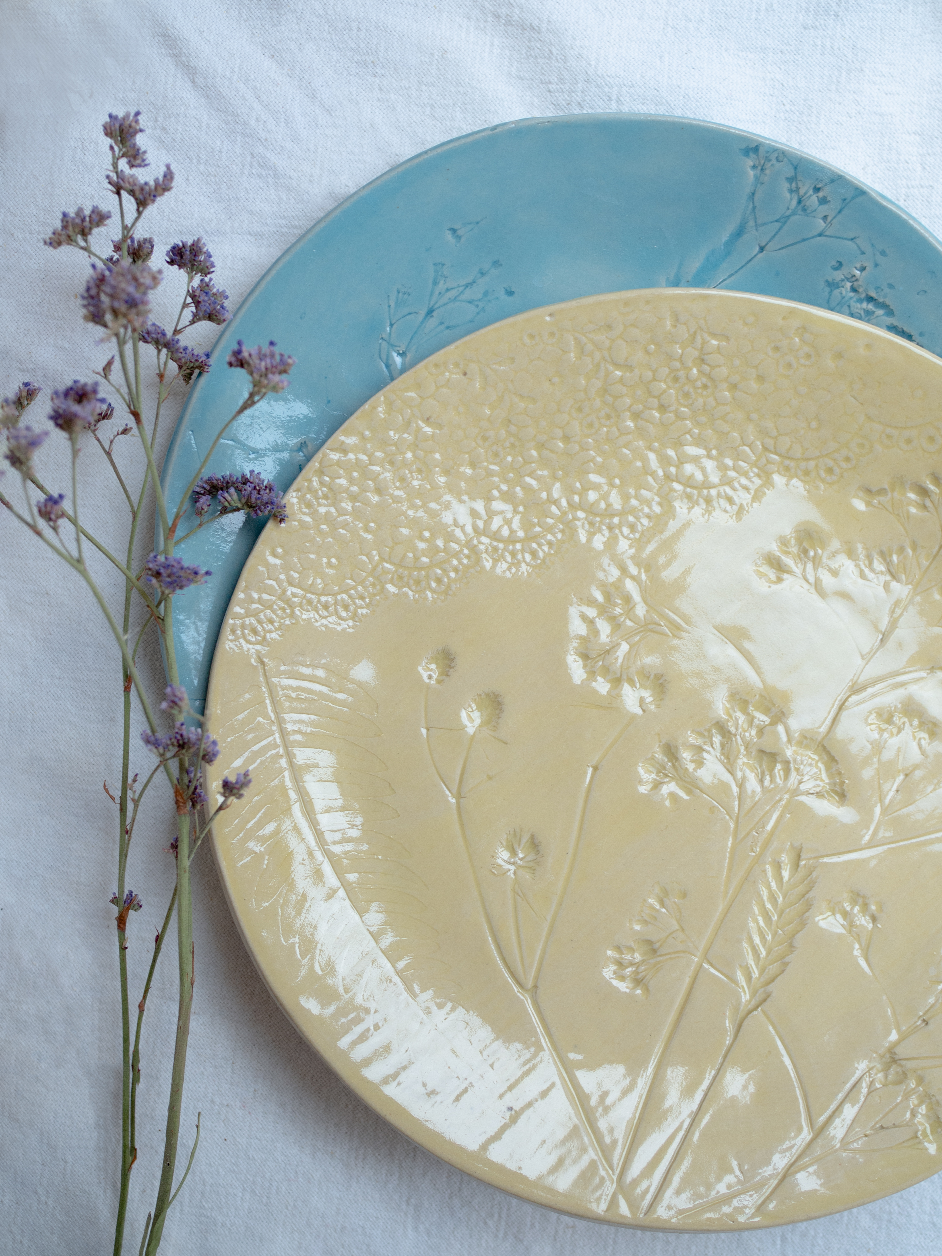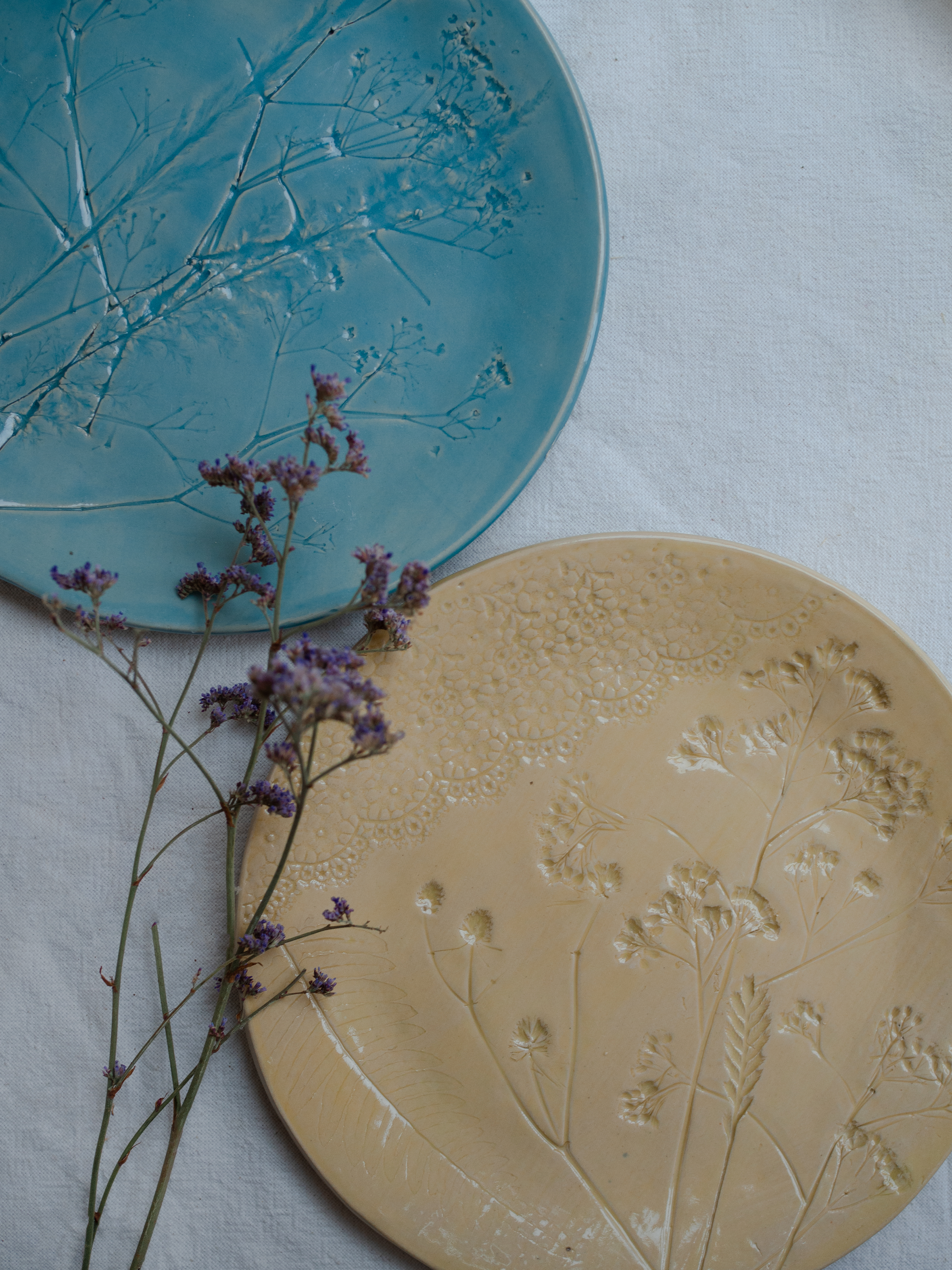 Мастер-класс простой, но 2 часа пролетают незаметно. Для того, чтобы сделать одну тарелку, нужно вначале от души простучать кусок глины, раскатать его ровно и тонко, тщательно проверить на возможные пузырьки воздуха. Потом загладить с двух сторон специальной пластинкой. Дальше самое творческое и интересное - придумываем узор, отпечатываем сухоцветы самых разных растений, а также узорными скалками и кружевами!